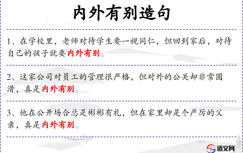 - 内外有别:指一个人在不同的环境或场合下表现出不同的行为或性格特点。