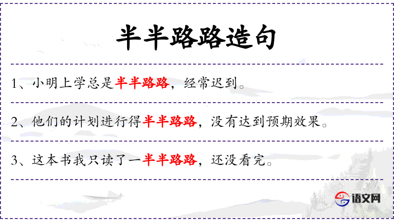 - 半半路路:这个表达比较口语化,通常用来形容事情进行得不彻底或不顺利。