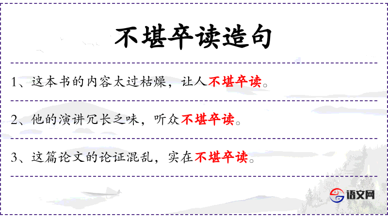 1. 【不堪卒读】 - 不堪:不能;卒:完毕,结束。形容文章写得凄惨悲苦,令人心酸,不忍读完。也指文章粗劣,使人不肯读下去。
