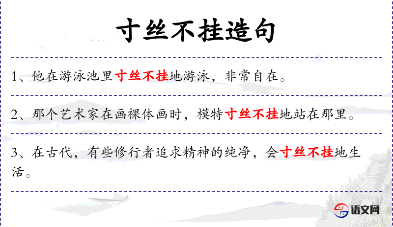 - 寸丝不挂:衣冠楚楚、穿戴整齐
