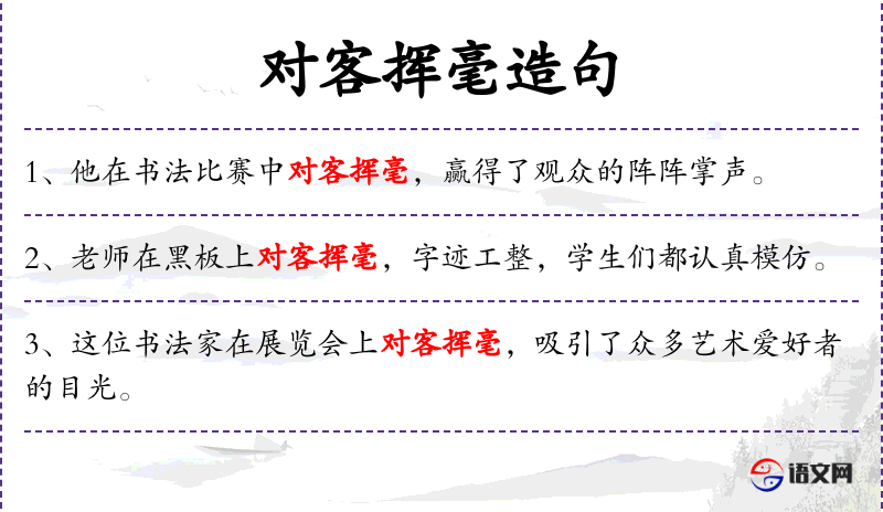 - 宾语:(挥毫的)客、(题字的)优秀员工