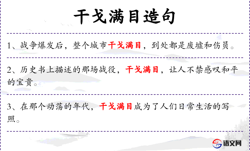 2. 【干戈满目】 干戈:古兵器,比喻战争。形容到处受到战争的摧残。
