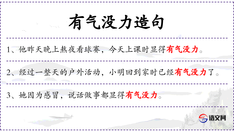 3. 【有气没力】 - 形容说话声音微弱,作事精神不振。也形容体弱无力。同“有气无力”。