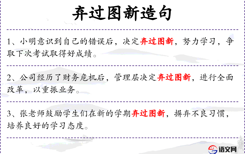 句子中的“弃过图新”是一个成语,反映了**文化中对自我改进和积极向上的价值观。这个成语鼓励人们在面对错误时要有勇气改变,追求更好的自己。