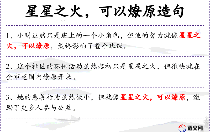 - 星星之火,可以燎原:这是一个**成语,源自***的讲话,比喻小的事物或力量可以发展成大的影响。