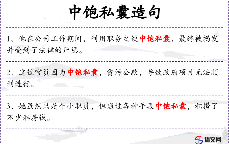 - 中饱私囊:指将公共或他人的财物据为己有。