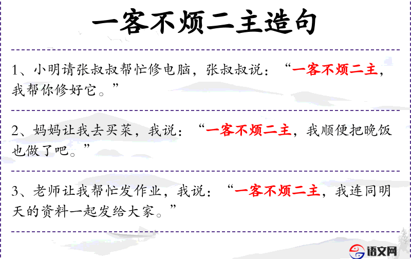 - 成语:“一客不烦二主”体现了**文化中的互助和不愿意麻烦他人的传统。