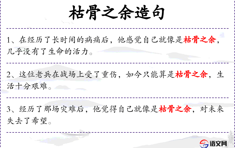 1. 【枯骨之余】 枯骨:白骨,引申为死人。比喻垂死的人。