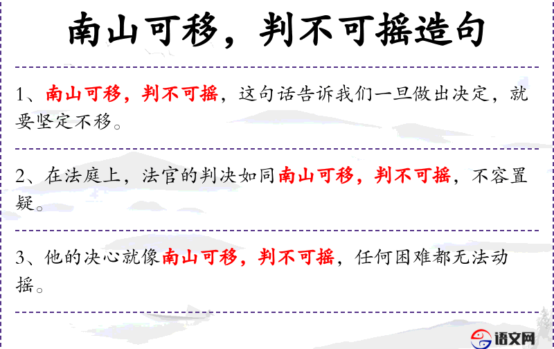 句子中“南山可移”是一个成语,源自《左传·僖公二十五年》:“南山可移,此案不可改也。”比喻事物的稳固不可动摇。这个成语在**文化中常用来强调法律和判决的不可更改性。