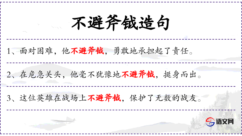 句子中的“不避斧钺”是一个成语,源自古代战争文化,强调在战斗中不退缩的勇气。这个成语在**文化中常用来形容人的勇敢和坚定。