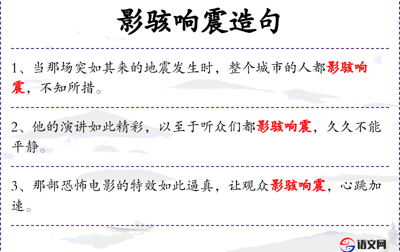 - 成语:“影骇响震”是一个成语,形容影响极大,使人震惊。