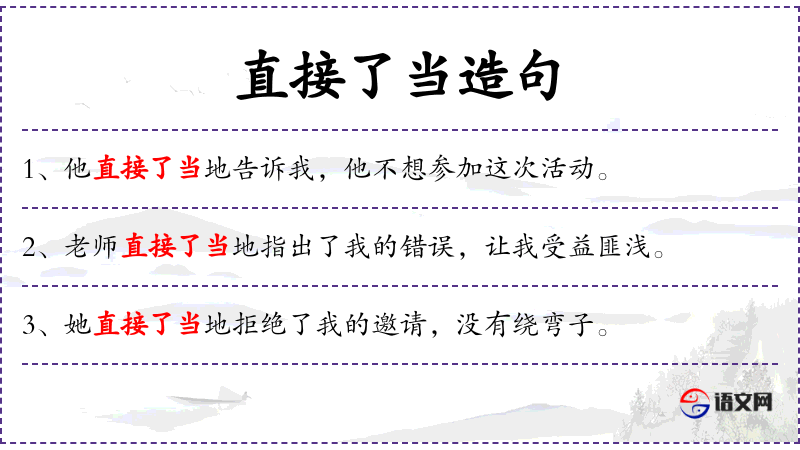 2. 【直接了当】 - 了当:干脆,爽快。形容说话做事爽快、不绕弯子