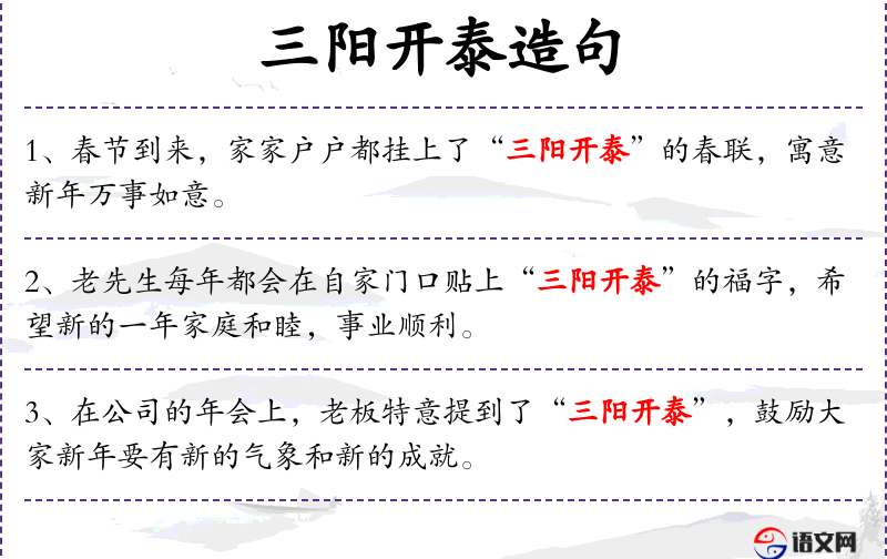 2. 【三阳开泰】 - 《周易》称爻连的为阳卦,断的为阴爻,正月为泰卦,三阳生于下;冬去春来,阴消阳长,有吉亨之象。常用以称颂岁首或寓意吉祥。