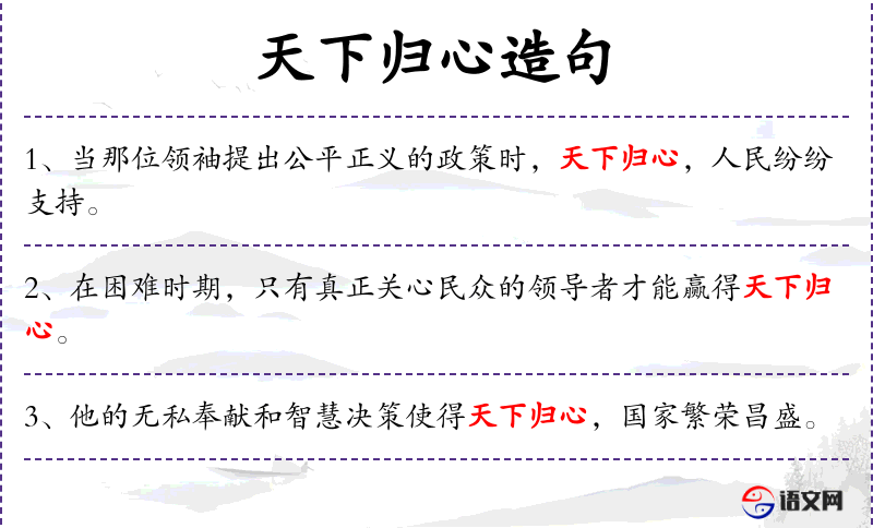 - 天下归心:成语,意为天下人都心悦诚服,归向某人。