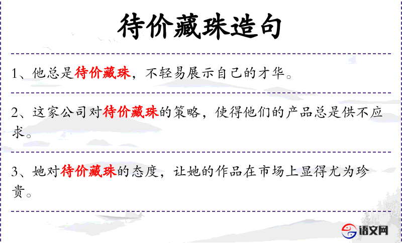 - 待价藏珠:这个成语源自**传统文化,比喻珍藏宝贵的东西,等待适当的时机展示或使用。