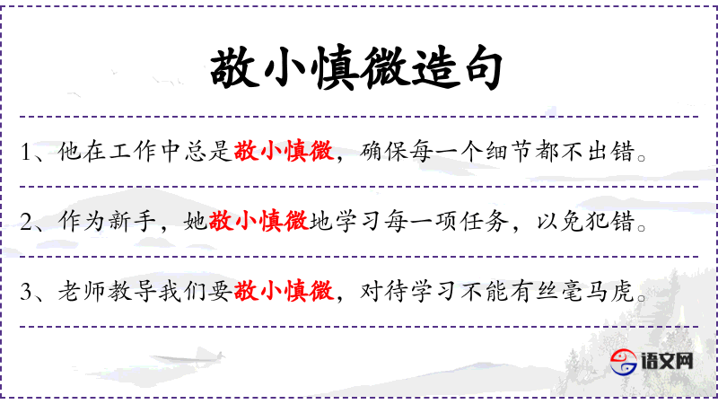 - 敬小慎微:形容词短语,表示非常小心谨慎。