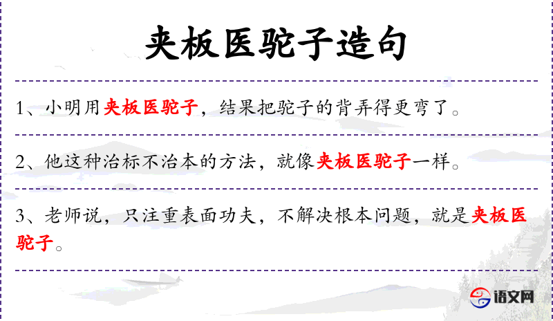 - 夹板医驼子:源自**古代的一个故事,比喻只治标不治本。