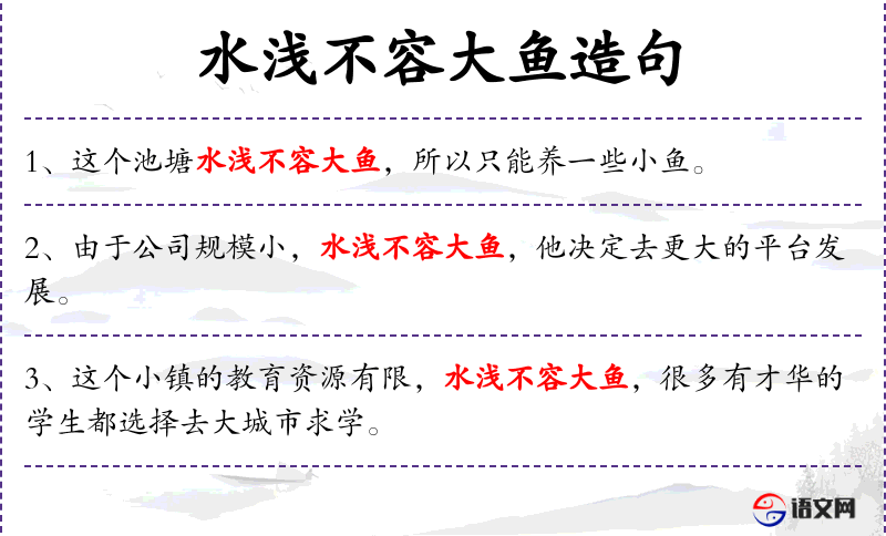 3. 【水浅不容大鱼】 容:容纳。指有才能的人无法在小地方或小单位发挥作用。