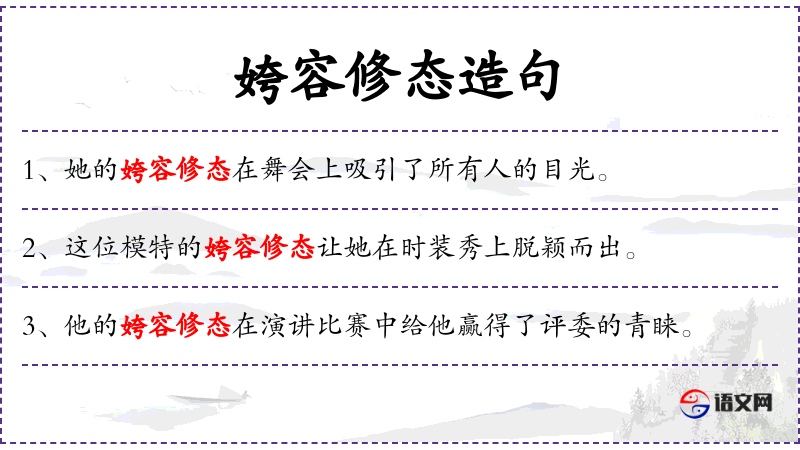 句子:“[他的姱容修态在辩论赛中显得格外有说服力。]”
