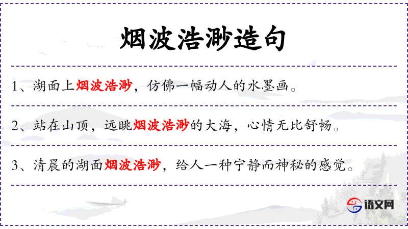 3. 【烟波浩渺】 - 烟波:雾霭苍茫的水面;浩渺:水面辽阔。形容烟雾笼罩的江湖水面广阔无边。