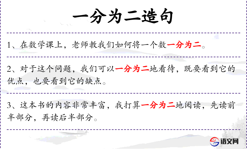 1. 【一分为二】 哲学用语,指事物作为矛盾的统一体,都包含着相互矛盾对立的两个方面。通常指全面看待人或事物,看到积极方面,也看到消极方面。