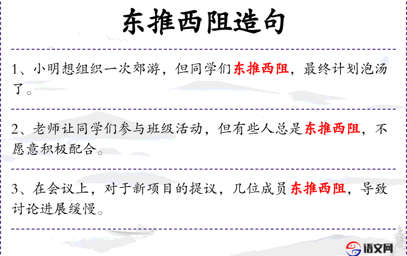 1. 【东推西阻】 推:推诿;阻:阻挠。找各种借口推托、阻挠。