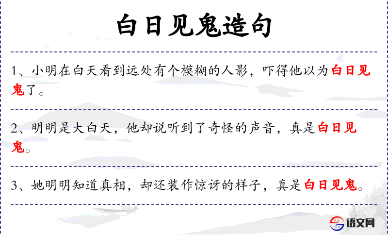 3. 【白日见鬼】 - 大白天看见鬼。指工部四曹无事可做,非常清闲。后泛指事情离奇古怪或无中生有。