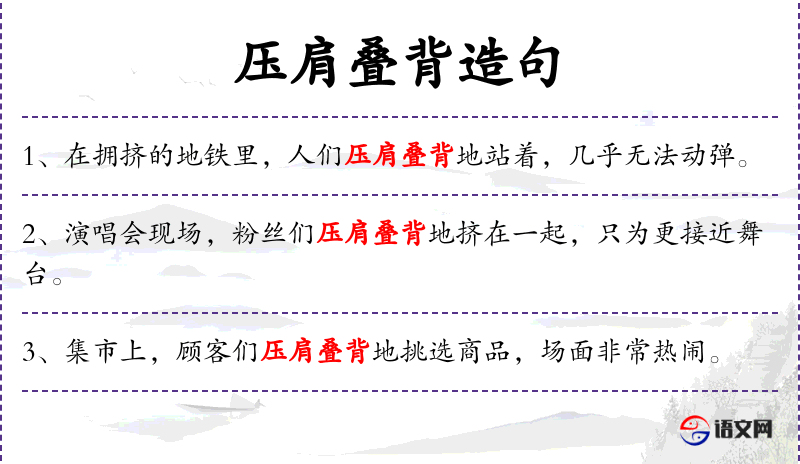 - 压肩叠背:成语,形容人多拥挤。