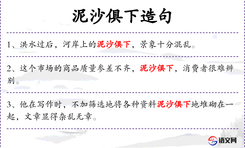 3. 【泥沙俱下】 指在江河的急流中泥土和沙子随着水一起冲下。比喻好人和坏人混杂在一起。