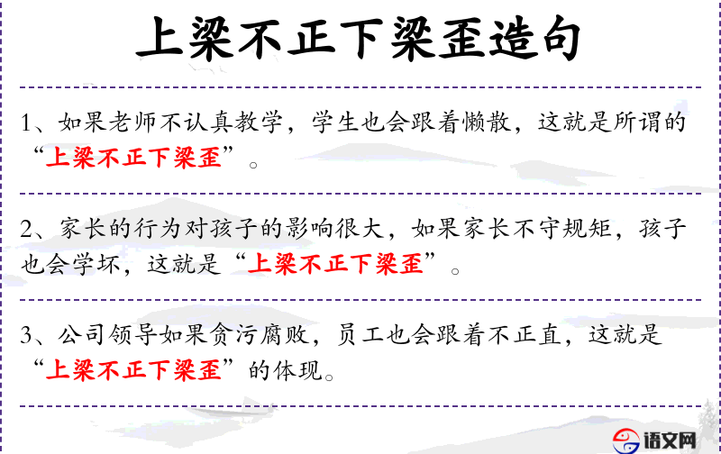 1. 【上梁不正下梁歪】 - 上梁:指上级或长辈。比喻在上的人行为不正,下面的人也跟着做坏事。