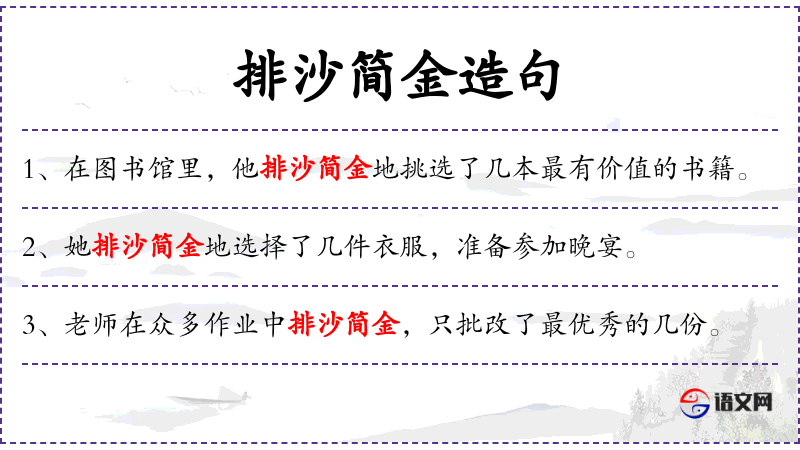 - 排沙简金:成语,比喻从大量事物中挑选精华。