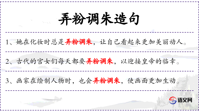 - 弄粉调朱:指女子化妆的行为,特别是指使用粉和胭脂。