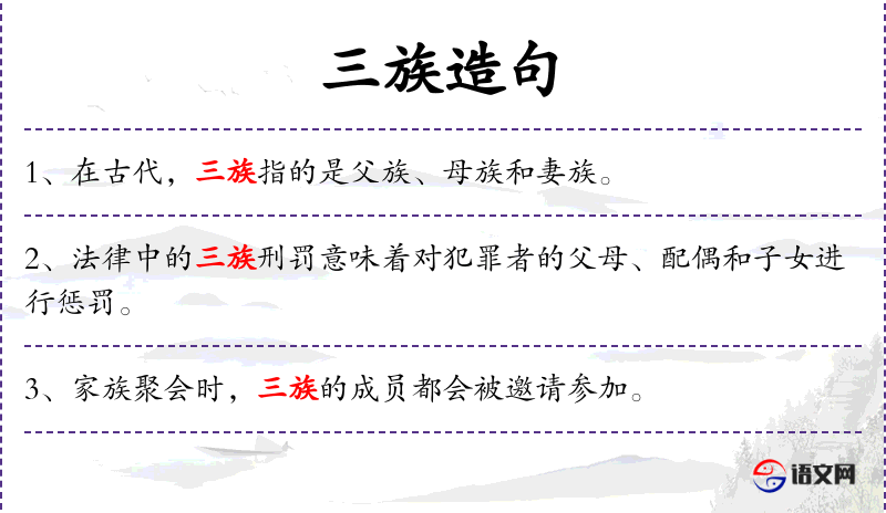 1. 【三族】 有几种说法。(1)谓父﹑子﹑孙。《周礼.春官.小宗伯》"掌三族之别,以辨亲疏。"郑玄注"三族,谓父﹑子﹑孙。"《仪礼.士昏礼》"惟是三族之不虞,使某也请吉日。"郑玄注"三族,谓父昆弟﹑己昆弟﹑子昆弟。"按,前注据父言之,故云子﹑孙;后注据子言之,故云己与子,二注义同。参阅孙诒让《周礼正义》。(2)谓父族﹑母族﹑妻族。《大戴礼记.保傅》"三族辅之。"卢辩注"三族,父族﹑母族﹑妻族。"《庄子.徐无鬼》"夫与国君同食,泽及三族,而况父母乎!"成玄英疏"三族,谓父母族﹑妻族也。"《后汉书.杨终传》"秦政酷烈,违忤天心,一人有罪,延及三族。"李贤注引《汉书音义》"父族﹑母族﹑妻族也。"(3)谓父母﹑兄弟﹑妻子。《史记.秦本纪》"法初有三族之罪。"裴髎集解引张晏曰"父母﹑兄弟﹑妻子也。" 2.指一人犯罪而诛其三族; 指上古帝鸿﹑少暤﹑颛顼之不才子,即浑沌﹑穷奇﹑梼杌。