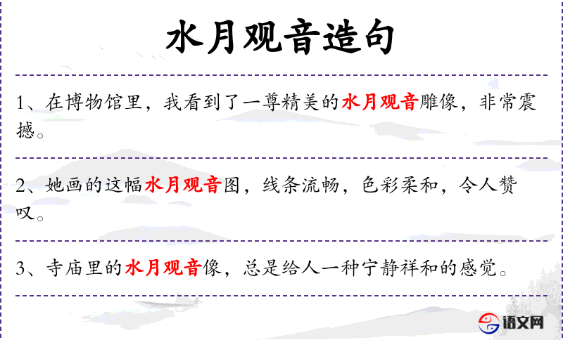 4. 【水月观音】 - 佛经谓观音菩萨有三十三个不同形象的法身,画作观水中月影状的称水月观音。见《法华经·普门品》。后用以喻人物仪容清。
