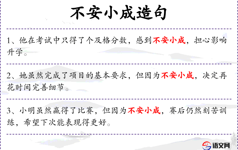 - 不安小成:成语,表示虽然取得了一些成就,但内心仍然感到不安或不满意。