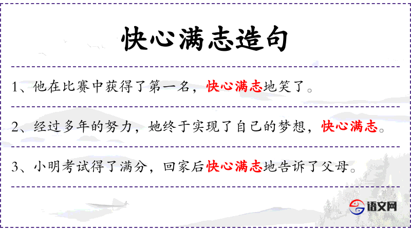 - 成语:快心满志,源自**传统文化,表示心情愉快,志得意满。