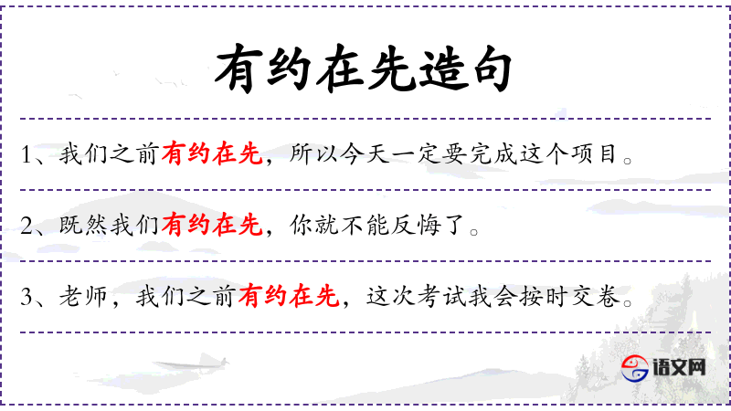 4. 【有约在先】 - 已经约定好了。指事情的处理方案已事先定好。