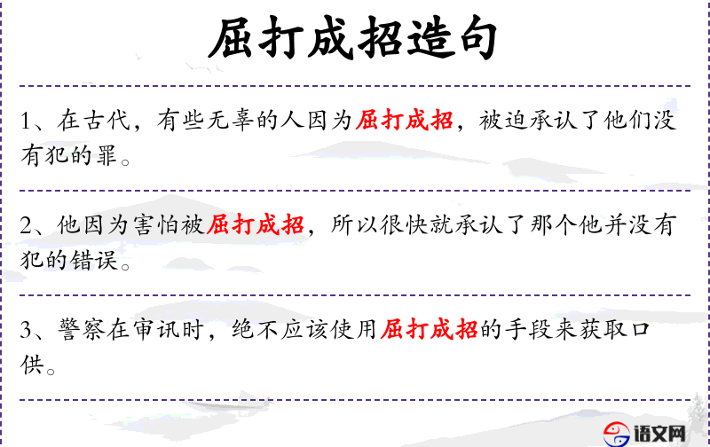 - 成语:屈打成招是一个成语,源自**古代的法律实践,反映了司法不公和冤案的问题。
