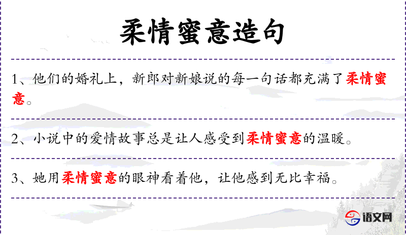 1. 【柔情蜜意】 - 温柔甜蜜的情意。