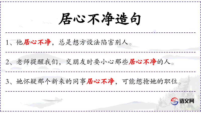 - 居心不净:成语,表示心怀不轨或动机不纯。