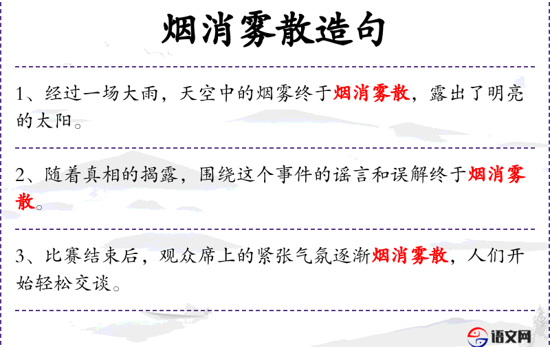 4. 【烟消雾散】 比喻事物消失得干干净净。同“烟消云散”。