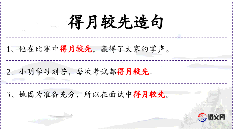 - 得月较先:成语,字面意思是“得到月亮比较早”,这里比喻在比赛中取得领先或优势。