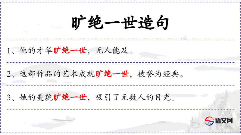 - 旷绝一世:形容某事物在某一方面达到了极高的水平,无人能及。