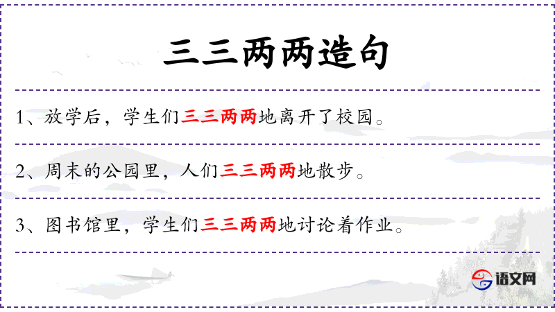 1. 【三三两两】 - 三个两个地在一起。形容人数不多。