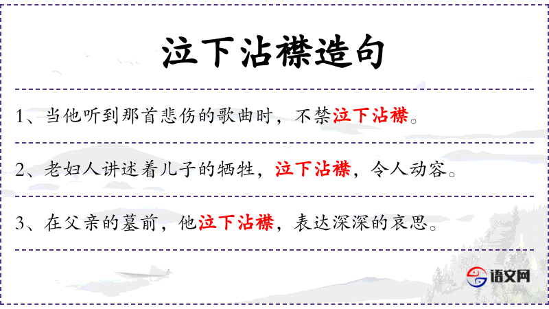 1. 【泣下沾襟】 - 襟:衣服胸前的部分。泪水滚滚流下,沾湿衣服前襟。哭得非常悲伤。