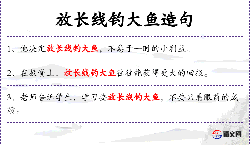 - 放长线钓大鱼:成语,比喻做事要有长远规划,不急于求成。