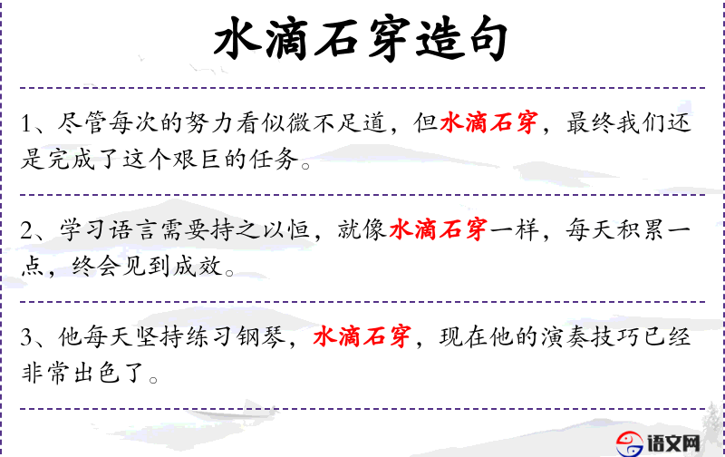 2. 【水滴石穿】 - 水不停地滴,石头也能被滴穿。比喻只要有恒心,不断努力,事情就一定能成功。