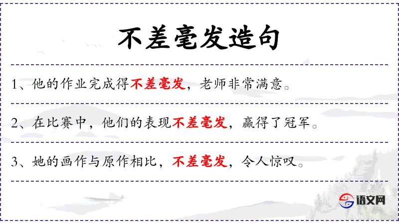 - 相关成语:“不差毫发”源自**古代对技艺高超的描述,类似的成语还有“如出一辙”、“一模一样”等。