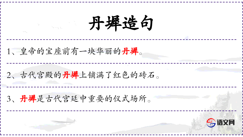 - 丹墀:在**传统文化中,丹墀象征着皇权和尊贵,常用于宫殿建筑。