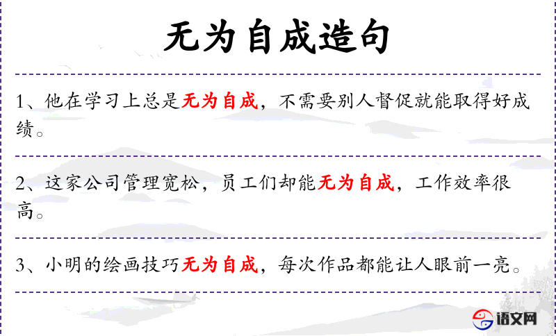 - 无为自成:表示事情自然而然地形成或达到某种状态,不需要刻意努力。